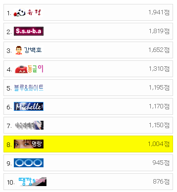 10위까지의 다~~ 걸들인가 보져... 강백호님은(??) 도데체 알수가 없군... 이동네는...머야 뭔가 보이지 않는 비결이 있는것 같은디.. 오픈을 안하네 뒈져라고 리플달고 글써도 안되드만... 별로 표시가 않나요...ㅠㅠ 잘 안보는 카페 구석에다가 다 쌓놓기라도 하나?? 그럼 몰라도... 정상적으론...